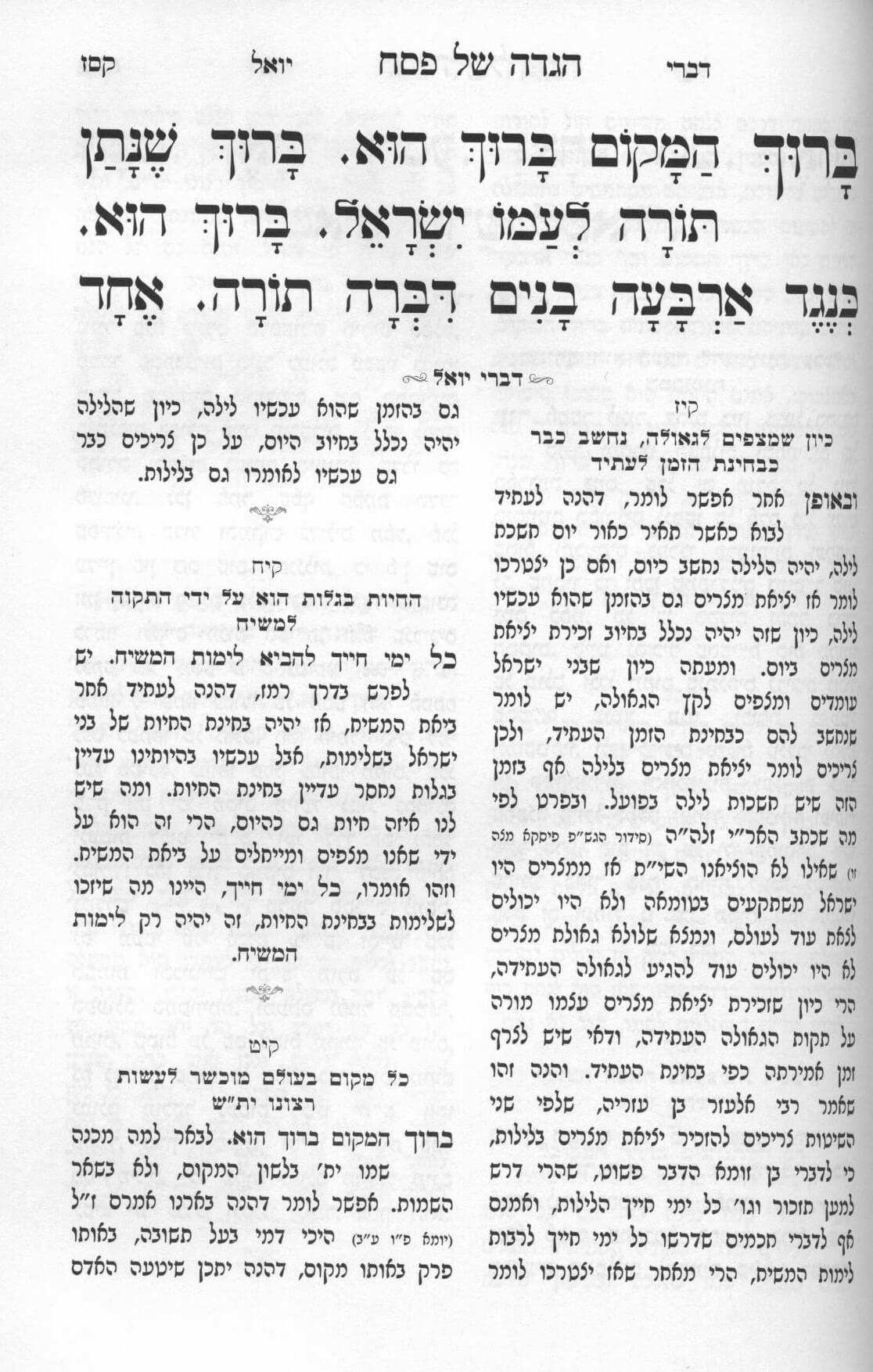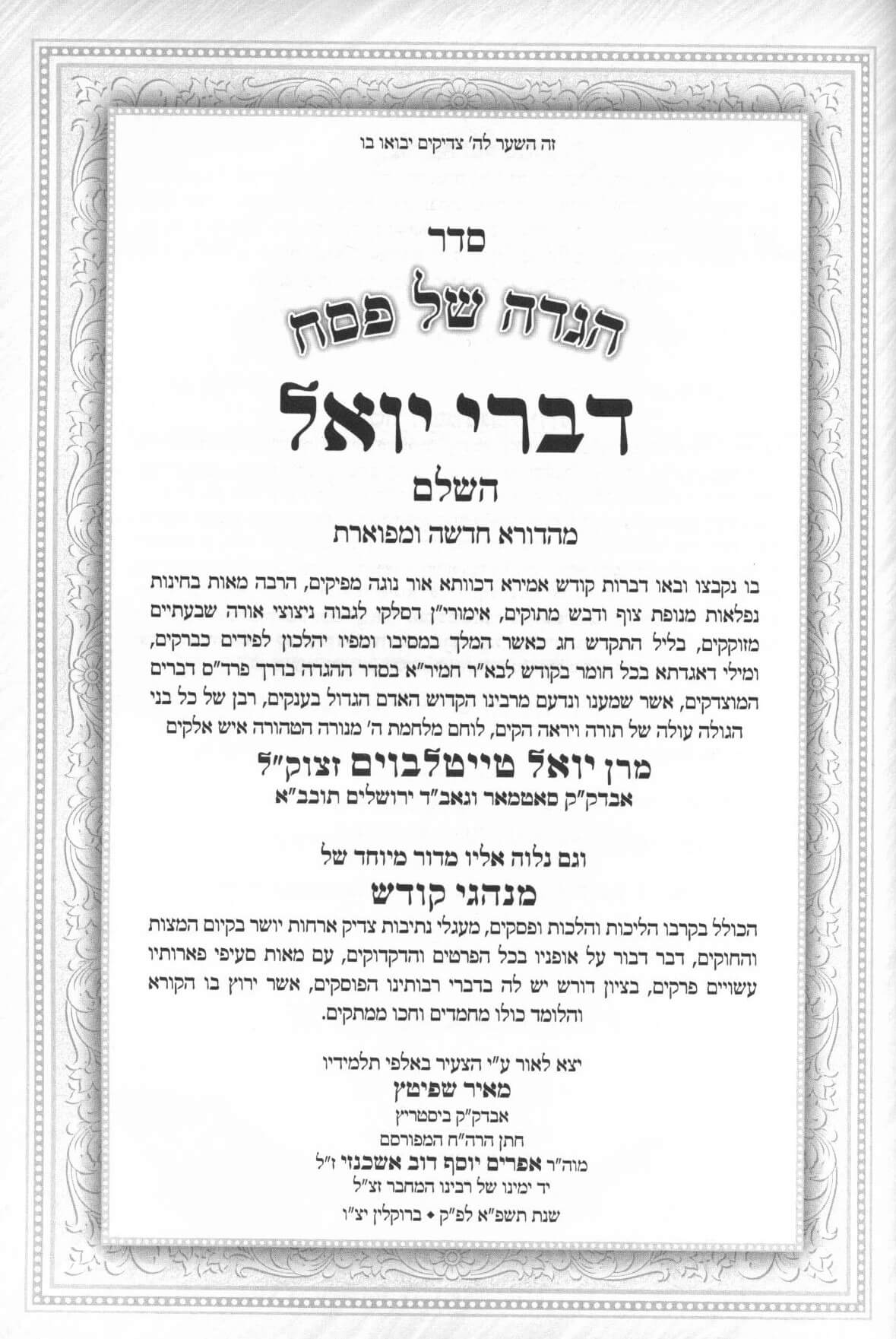 כולל יותר מד' מאות דרושים שנאמרו בליל הסדר, דברי אלקים חיים, להמשתוקקים להשביע נפשם מבאר מים חיים, שיצא מפום ממלל רברבין מאורן ורבן של ישראל כ"ק מרן רבינו הקדוש מסאטמאר זי"ע