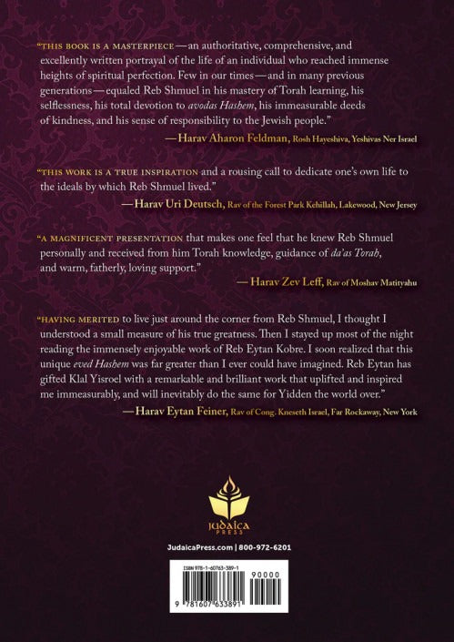 Although finite words can’t capture this spiritual grandeur in all its depth and fullness, this book gives the reader a fascinating, close-up view of the enthralling mosaic of greatness that is Reb Shmuel Auerbach’s life.