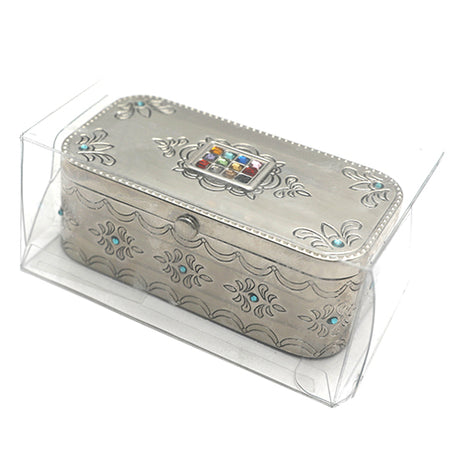 Nickel Travel Size Candlesticks In A Box With Cover Inlaid With Light Blue Stones 4x9 Cm- "filigree"