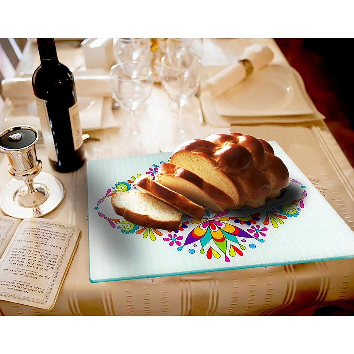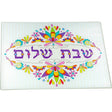 Challah Cutting Board and Tray - Tempered Glass with Beautiful Painted Shabbat Pattern and Design - by The Kosher Cook