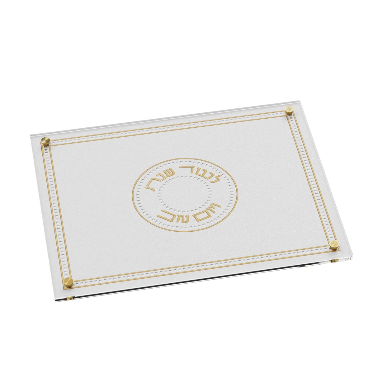 Indulge in luxury with the Leatherite Gilded Radiance Challah Board, exquisitely crafted with an embroidered leather design and topped with lucite and tempered glass. Available in gold, silver, full gold, and full silver, this board is the epitome of luxury and elegance. Elevate your Shabbos and Yom Tov table with this stunning piece of functional art.