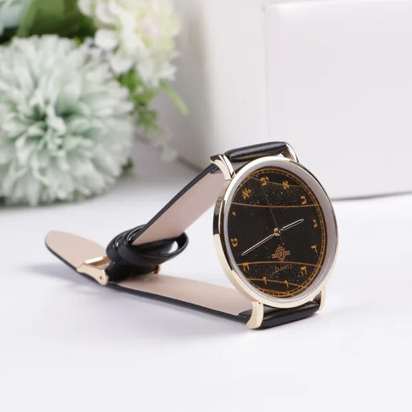 Watch With Aleph Bais" Black Handle Black Face Gold Rim