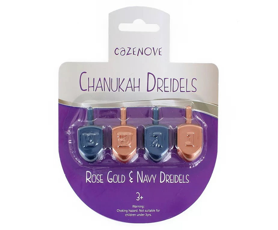 Play the classic game of dreidel with these rose gold & navy dreidels. Each pack contains 4 dreidels. Pack consists of 2 rose gold and 2 navy dreidels.