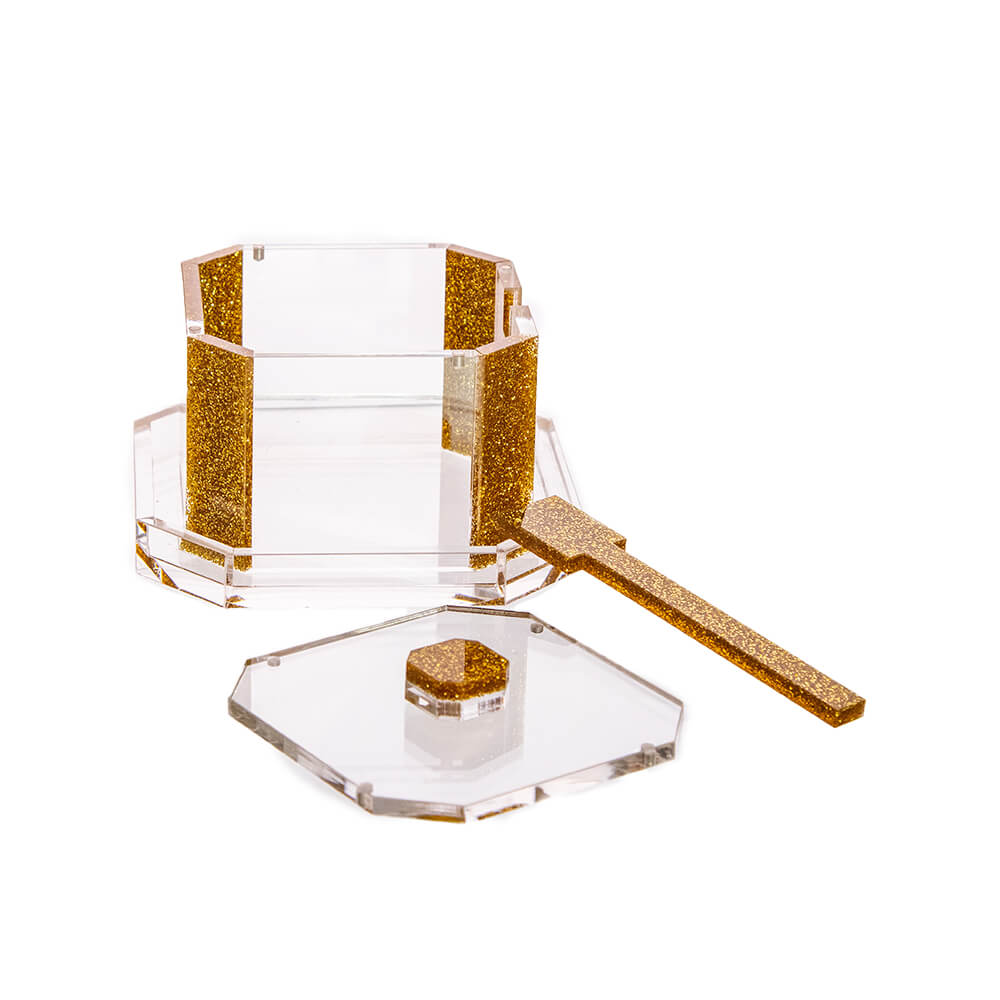 An exquisite honey jar designed with all your needs in mind. New larger dish, with a magnetic lid and matching glitter spoon for easy spreading. Complete the perfect dish with its acrylic base to catch any sticky drips!