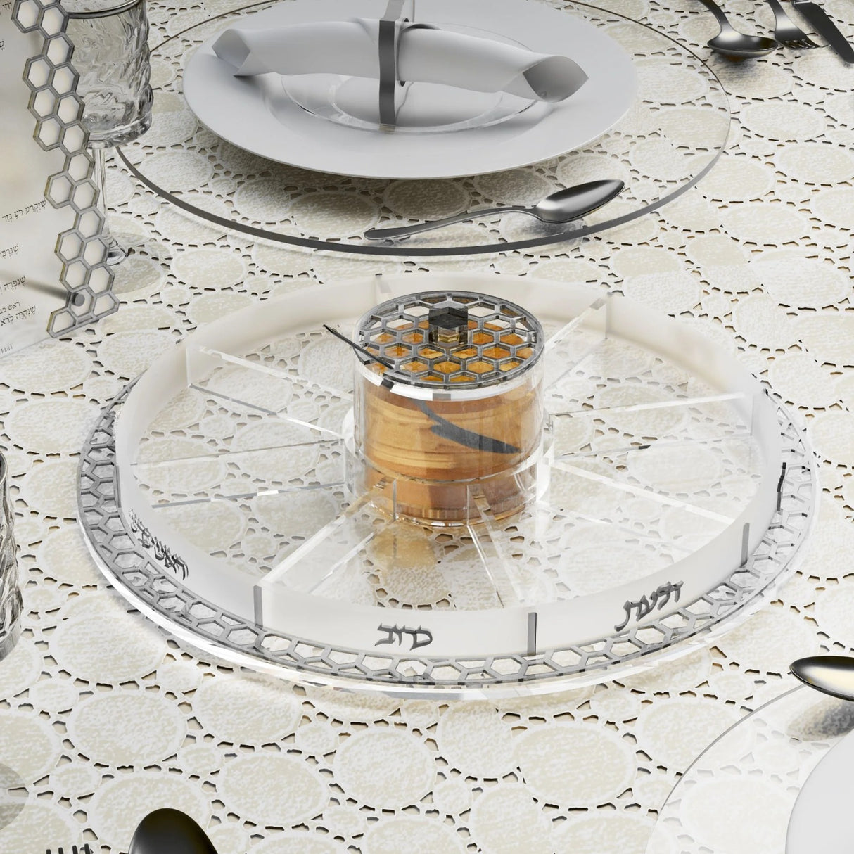 The Honeycomb Simanim Tray is a sophisticated centerpiece for your Rosh Hashanah table. Featuring eight compartments with 3D raised titles, a classic laser cut honeycomb design and available in gold or silver editions, this tray offers a clear and elegant presentation of each of the Simanim. Its swivel base allows effortless access to every section, while the removable honey dish with a matching spoon at the center offers an elegant enhancement. Designed to blend functionality with graceful style, this exquisite tray enhances your Yom Tov table with meaningful detail.