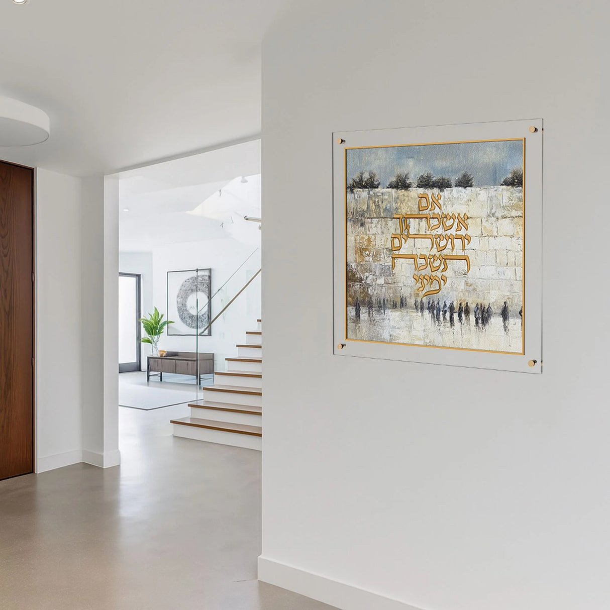 Enhance your home with the exquisite and unparalleled beauty of the Leatherite Im Eshkocheich - Beis Hamikdash. This luxurious piece is crafted with a beautiful leather print, intricately embroidered with the text of 'im eshkocheich' and encased between two pieces of Lucite. As a piece of art, it serves as a reminder to never forget Yerushalayim, "If I forget Yerushalayim, let my right hand forget its skill".