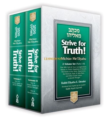In over a thousand lectures throughout his lifetime of teaching, the renowned master of mussar, Rabbi Eliyahu Eliezer Dessler offered countless inspiring and original insights into the ethics and philosophy of Torah Judaism. His shiurim were issued posthumously in a series of five Hebrew volumes entitled Michtav Me’Eliyahu, prepared by Rabbi Aryeh Carmell, one of Rabbi Dessler’s foremost disciples in England (in collaboration with Rabbi Solomon A. Halpern of London and Rabbi Chaim Friedlander of Bnei Brak). Michtav Me’Eliyahu has become a classic of modern Torah thought, widely read and studied. Rabbi Carmell then went on to render into matchless English selected essays from the Hebrew work, which became a six-part series entitled Strive for Truth! This series which was received with resounding acclaim, introduces us to some of Rabbi Dessler’s basic ideas and penetrating insights on the confusing, bewildering world around us. The essays in the first volume of this set and the first half of the second volume, comprising Parts 1, 2 and 3 of Strive for Truth!, explore and illuminate basic concepts in Judaism such as faith and trust, free will, lovingkindness, the power of the yetzer and repentance. The second half of the second volume, Part 4 of Strive for Truth! (originally entitled Sanctuaries in Time), takes the reader on a fascinating spiritual tour of the Festivals, fasts, and Holy Days of the Jewish year. Educators and students alike will delight in the many inspiring thoughts from one of mussar’s great masters.