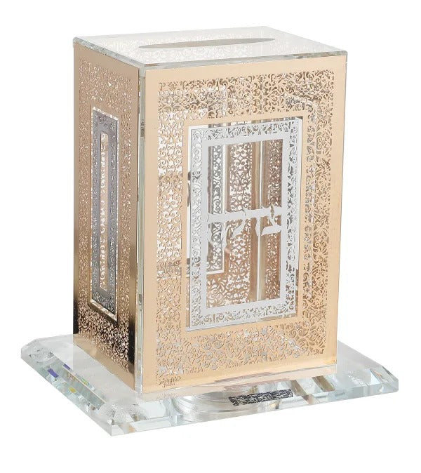 Crystal Tzedakah Holder with Gold and Silver Plates