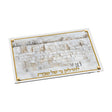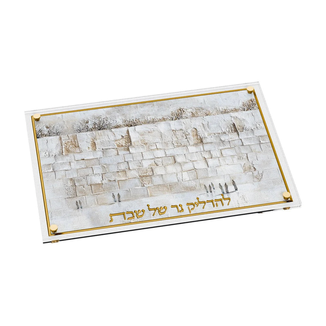 Presenting the Leatherite Artwork Hadlakos Neiros Tray in a stunning Serene Kosel design . This luxurious tray features a beautiful Serene Kosel artwork print on leather is topped with tempered glass for heat resistance. Perfect for Shabbos candles, adding a touch of elegance to any home.