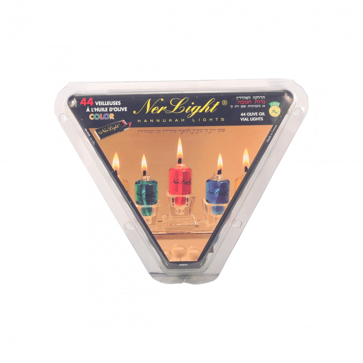 Ner Light one of the easiest way to prepare your Oil Menorah for lighting. In just seconds you can be ready to light your Menorah. All you need to do is pick up a glass vial pre-filled with pure olive oil, snap off the top with the "tool" included, and you are ready to light! Wicks are guaranteed to burn for at least 3 hours. You don't have to worry about the flames burning out, the wicks are held in place by the glass vial itself! Guaranteed to give you a bright flame! and is available in plain or multicolor olive oil. Each Triangle box contains 44 vials enough for the eight days of Chanukah.