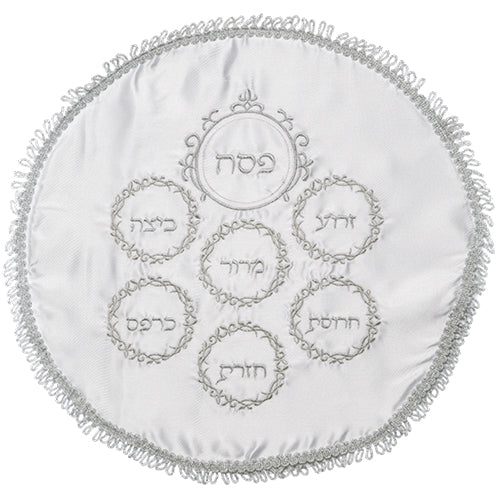 White Satin Passover Set With Silver Embroidery:passover And Afikoman Covers 46cm is backordered and will ship as soon as it is back in stock.