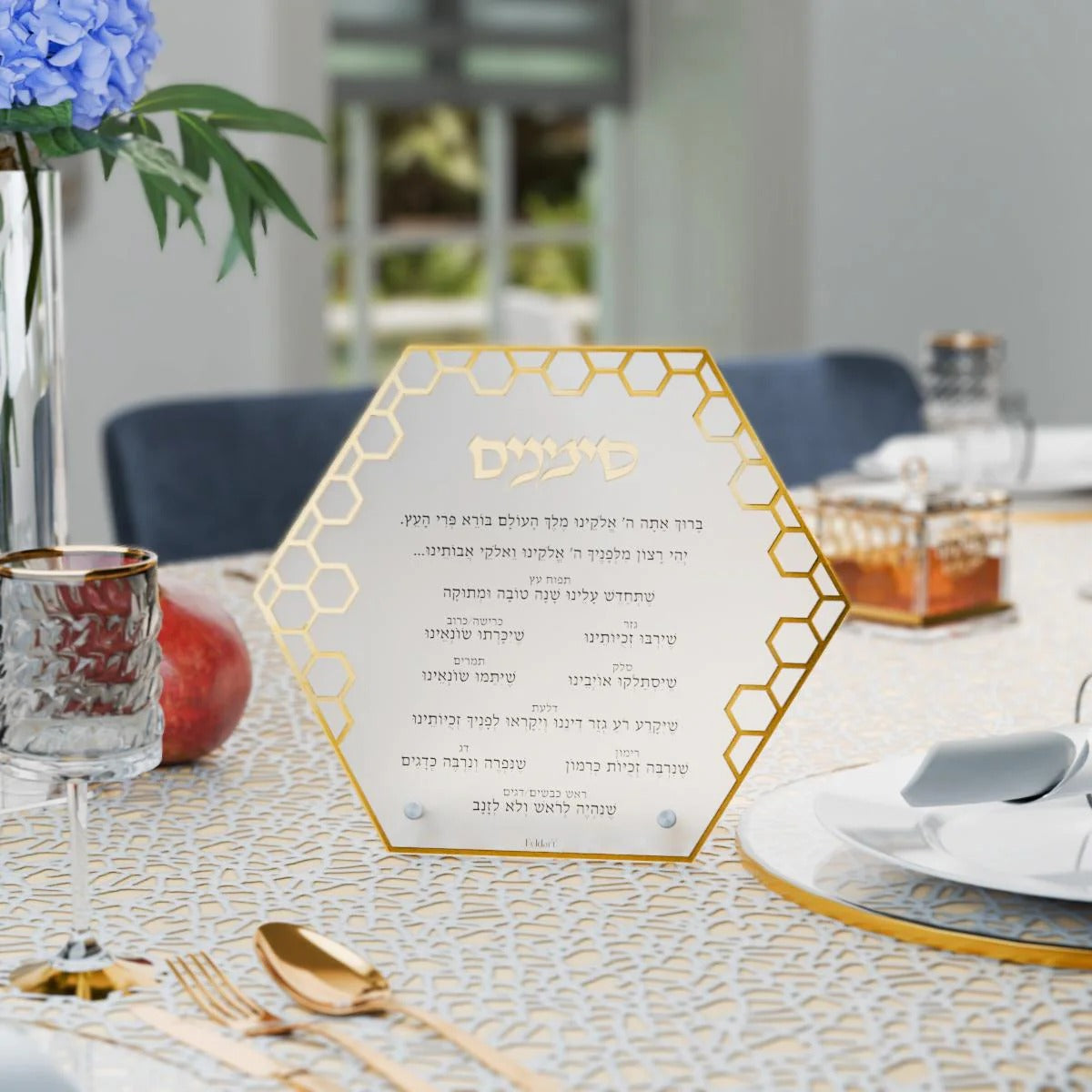 A stunning Laser Cut Honeycomb Simanim Card featuring a luxurious gold 3D raised title and honeycomb effect, is a tasteful and sophisticated addition to your Yom Tov table decor.