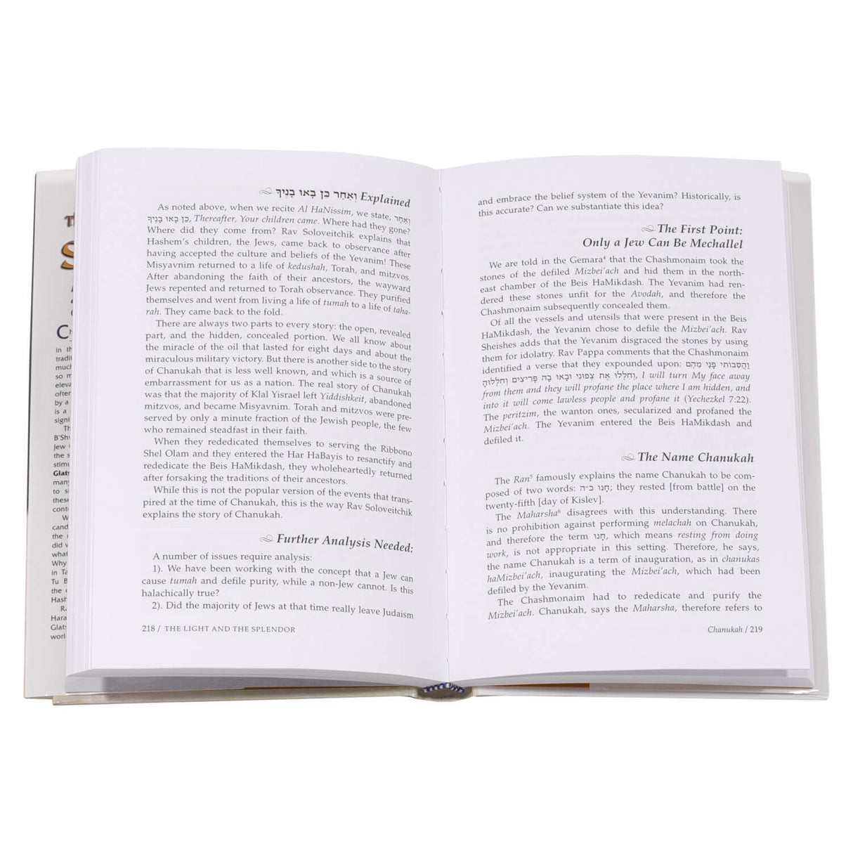 Revolutionize the Way You Look at Chanukah and Tu B’Shevat (and your life)! Chanukah - a time of joyous celebration -- the radiance of menorahs glimmering in the darkness, the family gatherings, the traditional foods and songs … Yet there is so much more depth and meaning to the holiday, so many rich and inspiring lessons it has to elevate our lives. And though Tu B’Shevat is often almost overlooked, or simply marked by a few moments of eating dried fruit, it, too, is a day of profound spiritual awakening and significance. The unexplored depths of Chanukah and Tu B’Shevat beckon the thoughtful and perceptive Jew to discover the treasures that lie beneath the surface. In this collection of wide-ranging, stimulating, and original essays, Rabbi Daniel Glatstein draws upon a vast array of sources, many of them rare and some almost unknown, to show us the deep inner dimensions of these two holidays, and how they relate to contemporary times. What makes the mitzvah of Chanukah candles “beloved to Hashem” -- and why is the mitzvah so hard to fulfill properly? Why did we need the miracle of the oil at all … and what does it tell us about our own daily lives? Why was the miracle of Chanukah not recorded in Tanach? What is the connection between Tu B’Shevat and repentance -- and what is the difference between the teshuvah of Rosh HaShanah and that of Tu B’Shevat? Rav and Founder of Machon Maggid Harakiah in Cedarhurst, New York, Rabbi Glatstein is one of the contemporary Jewish world’s most popular speakers and respected maggidei shiur. As you read these brilliant and illuminating essays, you will understand why his more than 5,000 shiurim have garnered literally millions of views and downloads on Torahanytime.com and other venues, while his Hebrew-language sefarim, too, have been acclaimed throughout the Torah world. Like the glowing flames of the Menorah, The Light and the Splendor brings us a luminous new understanding of Chanukah and Tu B’Shevat, an important contribution to Torah Literature and a precious gift to us all.