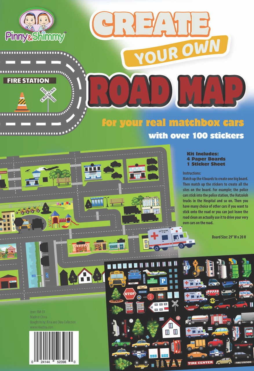 Instructions: Match up the 4 boards to create one big board. Then match up the stickers to create all the sites on the board. For example; the police cars stick into the police station, the Hatzoloh trucks in the Hospital and so on. Then you have many choice of other cars if you want to stick onto the road or you can just leave the road clean an actually use it to drive your very own cars on the road.