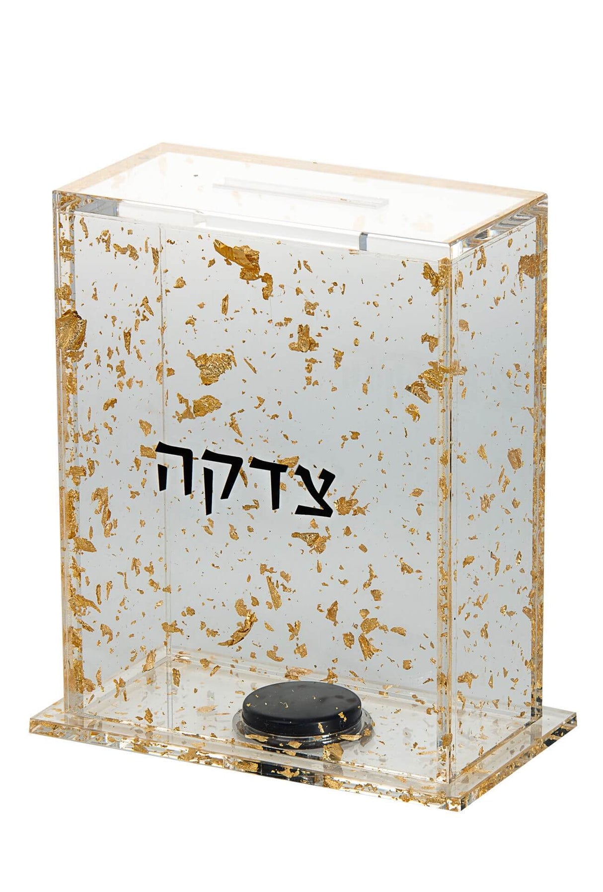 Tzadakah Box Lucite Sparkeled Gold is backordered and will ship as soon as it is back in stock.